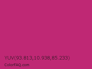 YUV 93.813,10.938,85.233 Color is a normal rose color and the nearest color is Hibiscus #b6316c. Hex code #bf2874 and RGB value is rgb(191,40,116). In RGB color space, this color is composed of 75% red, 16% green, 45% blue, In CMYK color space, this color is composed of 0% cyan, 79% magenta, 39% yellow , 25% black , In HSL color space, this color has a hue angle of 330° , 65% saturation and 45% lightness.