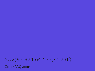 YUV 93.824,64.177,-4.231 Color is a normal indigo color and the nearest color is Majorelle Blue #6050dc. Hex code #5947e0 and RGB value is rgb(89,71,224). In RGB color space, this color is composed of 35% red, 28% green, 88% blue, In CMYK color space, this color is composed of 60% cyan, 68% magenta, 0% yellow , 12% black , In HSL color space, this color has a hue angle of 247° , 71% saturation and 58% lightness.