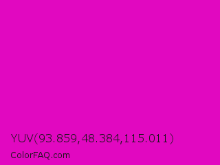 YUV 93.859,48.384,115.011 Color is a normal magenta color and the nearest color is Deep Magenta #cc00cc. Hex code #e108c0 and RGB value is rgb(225,8,192). In RGB color space, this color is composed of 88% red, 3% green, 75% blue, In CMYK color space, this color is composed of 0% cyan, 96% magenta, 15% yellow , 12% black , In HSL color space, this color has a hue angle of 309° , 93% saturation and 46% lightness.