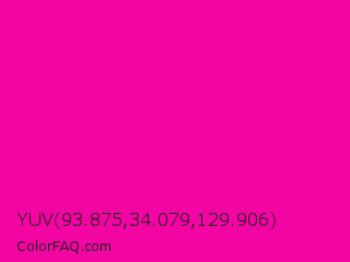 YUV 93.875,34.079,129.906 Color is a normal magenta color and the nearest color is Hollywood Cerise #f400a1. Hex code #f205a3 and RGB value is rgb(242,5,163). In RGB color space, this color is composed of 95% red, 2% green, 64% blue, In CMYK color space, this color is composed of 0% cyan, 98% magenta, 33% yellow , 5% black , In HSL color space, this color has a hue angle of 320° , 96% saturation and 48% lightness.