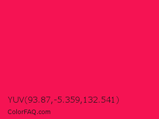 YUV 93.87,-5.359,132.541 Color is a normal rose color and the nearest color is Red Crayola #ee204d. Hex code #f51353 and RGB value is rgb(245,19,83). In RGB color space, this color is composed of 96% red, 7% green, 33% blue, In CMYK color space, this color is composed of 0% cyan, 92% magenta, 66% yellow , 4% black , In HSL color space, this color has a hue angle of 343° , 92% saturation and 52% lightness.