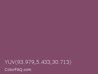 YUV 93.979,5.433,30.713 Color is a normal magenta color and the nearest color is Twilight Lavender #8a496b. Hex code #814a69 and RGB value is rgb(129,74,105). In RGB color space, this color is composed of 51% red, 29% green, 41% blue, In CMYK color space, this color is composed of 0% cyan, 43% magenta, 19% yellow , 49% black , In HSL color space, this color has a hue angle of 326° , 27% saturation and 40% lightness.
