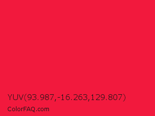 YUV 93.987,-16.263,129.807 Color is a normal red color and the nearest color is Red Ribbon #ed0a3f. Hex code #f2193d and RGB value is rgb(242,25,61). In RGB color space, this color is composed of 95% red, 10% green, 24% blue, In CMYK color space, this color is composed of 0% cyan, 90% magenta, 75% yellow , 5% black , In HSL color space, this color has a hue angle of 350° , 89% saturation and 52% lightness.