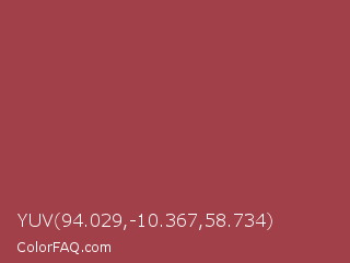 YUV 94.029,-10.367,58.734 Color is a normal red color and the nearest color is Copper Rust #944747. Hex code #a14049 and RGB value is rgb(161,64,73). In RGB color space, this color is composed of 63% red, 25% green, 29% blue, In CMYK color space, this color is composed of 0% cyan, 60% magenta, 55% yellow , 37% black , In HSL color space, this color has a hue angle of 354° , 43% saturation and 44% lightness.