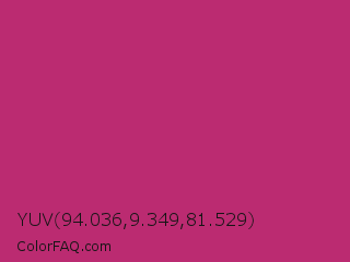 YUV 94.036,9.349,81.529 Color is a normal rose color and the nearest color is Hibiscus #b6316c. Hex code #bb2b71 and RGB value is rgb(187,43,113). In RGB color space, this color is composed of 73% red, 17% green, 44% blue, In CMYK color space, this color is composed of 0% cyan, 77% magenta, 40% yellow , 27% black , In HSL color space, this color has a hue angle of 331° , 63% saturation and 45% lightness.