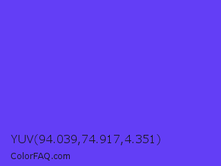 YUV 94.039,74.917,4.351 Color is a normal indigo color and the nearest color is Majorelle Blue #6050dc. Hex code #633ef6 and RGB value is rgb(99,62,246). In RGB color space, this color is composed of 39% red, 24% green, 96% blue, In CMYK color space, this color is composed of 60% cyan, 75% magenta, 0% yellow , 4% black , In HSL color space, this color has a hue angle of 252° , 91% saturation and 60% lightness.