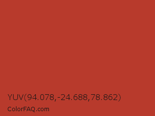 YUV 94.078,-24.688,78.862 Color is a normal red color and the nearest color is International Orange Golden Gate Bridge #c0362c. Hex code #b83a2c and RGB value is rgb(184,58,44). In RGB color space, this color is composed of 72% red, 23% green, 17% blue, In CMYK color space, this color is composed of 0% cyan, 68% magenta, 76% yellow , 28% black , In HSL color space, this color has a hue angle of 6° , 61% saturation and 45% lightness.