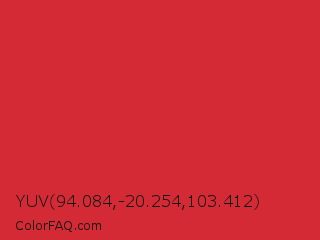 YUV 94.084,-20.254,103.412 Color is a normal red color and the nearest color is Amaranth Red #d3212d. Hex code #d42a35 and RGB value is rgb(212,42,53). In RGB color space, this color is composed of 83% red, 16% green, 21% blue, In CMYK color space, this color is composed of 0% cyan, 80% magenta, 75% yellow , 17% black , In HSL color space, this color has a hue angle of 356° , 67% saturation and 50% lightness.
