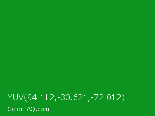 YUV 94.112,-30.621,-72.012 Color is a normal green color and the nearest color is North Texas Green #059033. Hex code #0c9420 and RGB value is rgb(12,148,32). In RGB color space, this color is composed of 5% red, 58% green, 13% blue, In CMYK color space, this color is composed of 92% cyan, 0% magenta, 78% yellow , 42% black , In HSL color space, this color has a hue angle of 129° , 85% saturation and 31% lightness.