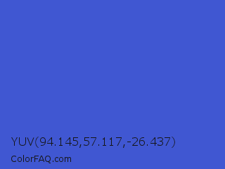 YUV 94.145,57.117,-26.437 Color is a normal blue color and the nearest color is Han Blue #446ccf. Hex code #4057d2 and RGB value is rgb(64,87,210). In RGB color space, this color is composed of 25% red, 34% green, 82% blue, In CMYK color space, this color is composed of 70% cyan, 59% magenta, 0% yellow , 18% black , In HSL color space, this color has a hue angle of 231° , 62% saturation and 54% lightness.