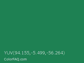 YUV 94.155,-5.499,-56.264 Color is a normal green color and the nearest color is Eucalyptus #278a5b. Hex code #1e8153 and RGB value is rgb(30,129,83). In RGB color space, this color is composed of 12% red, 51% green, 33% blue, In CMYK color space, this color is composed of 77% cyan, 0% magenta, 36% yellow , 49% black , In HSL color space, this color has a hue angle of 152° , 62% saturation and 31% lightness.