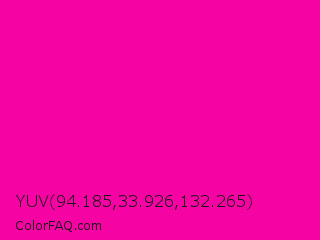 YUV 94.185,33.926,132.265 Color is a normal magenta color and the nearest color is Hollywood Cerise #f400a1. Hex code #f504a3 and RGB value is rgb(245,4,163). In RGB color space, this color is composed of 96% red, 2% green, 64% blue, In CMYK color space, this color is composed of 0% cyan, 98% magenta, 33% yellow , 4% black , In HSL color space, this color has a hue angle of 320° , 97% saturation and 49% lightness.
