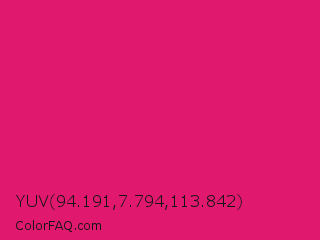 YUV 94.191,7.794,113.842 Color is a normal rose color and the nearest color is Dogwood Rose #d71868. Hex code #e0196e and RGB value is rgb(224,25,110). In RGB color space, this color is composed of 88% red, 10% green, 43% blue, In CMYK color space, this color is composed of 0% cyan, 89% magenta, 51% yellow , 12% black , In HSL color space, this color has a hue angle of 334° , 80% saturation and 49% lightness.