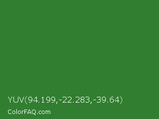 YUV 94.199,-22.283,-39.64 Color is a normal green color and the nearest color is Forest Green #228b22. Hex code #317e31 and RGB value is rgb(49,126,49). In RGB color space, this color is composed of 19% red, 49% green, 19% blue, In CMYK color space, this color is composed of 61% cyan, 0% magenta, 61% yellow , 51% black , In HSL color space, this color has a hue angle of 120° , 44% saturation and 34% lightness.
