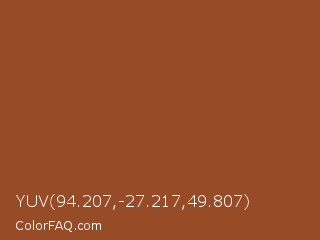 YUV 94.207,-27.217,49.807 Color is a normal orange color and the nearest color is Cumin #924321. Hex code #974c27 and RGB value is rgb(151,76,39). In RGB color space, this color is composed of 59% red, 30% green, 15% blue, In CMYK color space, this color is composed of 0% cyan, 50% magenta, 74% yellow , 41% black , In HSL color space, this color has a hue angle of 20° , 59% saturation and 37% lightness.