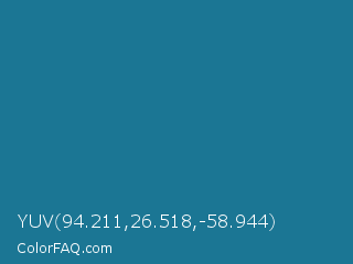 YUV 94.211,26.518,-58.944 Color is a normal blue color and the nearest color is Jelly Bean #297b9a. Hex code #1b7694 and RGB value is rgb(27,118,148). In RGB color space, this color is composed of 11% red, 46% green, 58% blue, In CMYK color space, this color is composed of 82% cyan, 20% magenta, 0% yellow , 42% black , In HSL color space, this color has a hue angle of 195° , 69% saturation and 34% lightness.