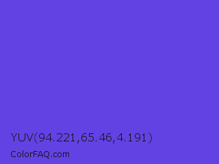 YUV 94.221,65.46,4.191 Color is a normal indigo color and the nearest color is Majorelle Blue #6050dc. Hex code #6342e3 and RGB value is rgb(99,66,227). In RGB color space, this color is composed of 39% red, 26% green, 89% blue, In CMYK color space, this color is composed of 56% cyan, 71% magenta, 0% yellow , 11% black , In HSL color space, this color has a hue angle of 252° , 74% saturation and 57% lightness.