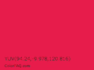 YUV 94.24,-9.978,120.816 Color is a normal red color and the nearest color is Spanish Crimson #e51a4c. Hex code #e81c4a and RGB value is rgb(232,28,74). In RGB color space, this color is composed of 91% red, 11% green, 29% blue, In CMYK color space, this color is composed of 0% cyan, 88% magenta, 68% yellow , 9% black , In HSL color space, this color has a hue angle of 346° , 82% saturation and 51% lightness.
