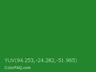 YUV 94.253,-24.282,-51.965 Color is a normal green color and the nearest color is Forest Green #228b22. Hex code #23862d and RGB value is rgb(35,134,45). In RGB color space, this color is composed of 14% red, 53% green, 18% blue, In CMYK color space, this color is composed of 74% cyan, 0% magenta, 66% yellow , 47% black , In HSL color space, this color has a hue angle of 126° , 59% saturation and 33% lightness.