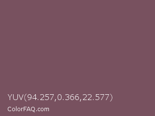 YUV 94.257,0.366,22.577 Color is a normal rose color and the nearest color is Russett #755a57. Hex code #78515f and RGB value is rgb(120,81,95). In RGB color space, this color is composed of 47% red, 32% green, 37% blue, In CMYK color space, this color is composed of 0% cyan, 33% magenta, 21% yellow , 53% black , In HSL color space, this color has a hue angle of 338° , 19% saturation and 39% lightness.