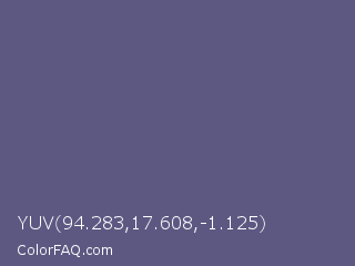 YUV 94.283,17.608,-1.125 Color is a normal indigo color and the nearest color is Comet #5c5d75. Hex code #5d5882 and RGB value is rgb(93,88,130). In RGB color space, this color is composed of 36% red, 35% green, 51% blue, In CMYK color space, this color is composed of 28% cyan, 32% magenta, 0% yellow , 49% black , In HSL color space, this color has a hue angle of 247° , 19% saturation and 43% lightness.