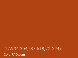 YUV 94.304,-37.618,72.524 Color is a normal orange color and the nearest color is Rust #b7410e. Hex code #b14312 and RGB value is rgb(177,67,18). In RGB color space, this color is composed of 69% red, 26% green, 7% blue, In CMYK color space, this color is composed of 0% cyan, 62% magenta, 90% yellow , 31% black , In HSL color space, this color has a hue angle of 18° , 82% saturation and 38% lightness.