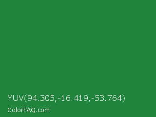 YUV 94.305,-16.419,-53.764 Color is a normal green color and the nearest color is Dark Spring Green #177245. Hex code #21843d and RGB value is rgb(33,132,61). In RGB color space, this color is composed of 13% red, 52% green, 24% blue, In CMYK color space, this color is composed of 75% cyan, 0% magenta, 54% yellow , 48% black , In HSL color space, this color has a hue angle of 137° , 60% saturation and 32% lightness.