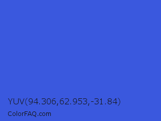 YUV 94.306,62.953,-31.84 Color is a normal blue color and the nearest color is Royal Blue #4169e1. Hex code #3a58de and RGB value is rgb(58,88,222). In RGB color space, this color is composed of 23% red, 35% green, 87% blue, In CMYK color space, this color is composed of 74% cyan, 60% magenta, 0% yellow , 13% black , In HSL color space, this color has a hue angle of 229° , 71% saturation and 55% lightness.