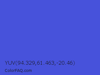 YUV 94.329,61.463,-20.46 Color is a normal blue color and the nearest color is Iris #5a4fcf. Hex code #4752db and RGB value is rgb(71,82,219). In RGB color space, this color is composed of 28% red, 32% green, 86% blue, In CMYK color space, this color is composed of 68% cyan, 63% magenta, 0% yellow , 14% black , In HSL color space, this color has a hue angle of 236° , 67% saturation and 57% lightness.