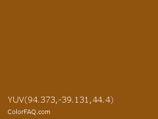YUV 94.373,-39.131,44.4 Color is a normal orange color and the nearest color is Korma #8f4b0e. Hex code #91540f and RGB value is rgb(145,84,15). In RGB color space, this color is composed of 57% red, 33% green, 6% blue, In CMYK color space, this color is composed of 0% cyan, 42% magenta, 90% yellow , 43% black , In HSL color space, this color has a hue angle of 32° , 81% saturation and 31% lightness.