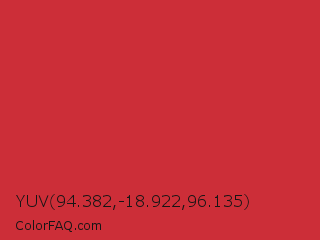 YUV 94.382,-18.922,96.135 Color is a normal red color and the nearest color is Madder Lake #cc3336. Hex code #cc2e38 and RGB value is rgb(204,46,56). In RGB color space, this color is composed of 80% red, 18% green, 22% blue, In CMYK color space, this color is composed of 0% cyan, 77% magenta, 73% yellow , 20% black , In HSL color space, this color has a hue angle of 356° , 63% saturation and 49% lightness.