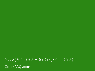 YUV 94.382,-36.67,-45.062 Color is a dark green color and the nearest color is La Palma #368716. Hex code #2b8714 and RGB value is rgb(43,135,20). In RGB color space, this color is composed of 17% red, 53% green, 8% blue, In CMYK color space, this color is composed of 68% cyan, 0% magenta, 85% yellow , 47% black , In HSL color space, this color has a hue angle of 108° , 74% saturation and 30% lightness.