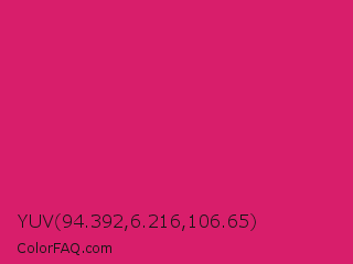 YUV 94.392,6.216,106.65 Color is a normal rose color and the nearest color is Dogwood Rose #d71868. Hex code #d81e6b and RGB value is rgb(216,30,107). In RGB color space, this color is composed of 85% red, 12% green, 42% blue, In CMYK color space, this color is composed of 0% cyan, 86% magenta, 50% yellow , 15% black , In HSL color space, this color has a hue angle of 335° , 76% saturation and 48% lightness.