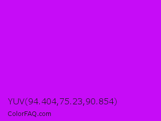 YUV 94.404,75.23,90.854 Color is a normal purple color and the nearest color is Vivid Orchid #cc00ff. Hex code #c60cf7 and RGB value is rgb(198,12,247). In RGB color space, this color is composed of 78% red, 5% green, 97% blue, In CMYK color space, this color is composed of 20% cyan, 95% magenta, 0% yellow , 3% black , In HSL color space, this color has a hue angle of 287° , 94% saturation and 51% lightness.