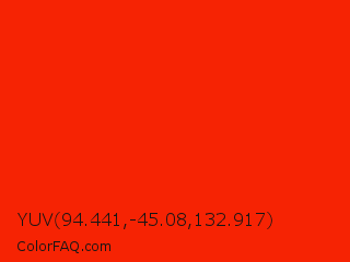 YUV 94.441,-45.08,132.917 Color is a normal red color and the nearest color is Scarlet #ff2400. Hex code #f62303 and RGB value is rgb(246,35,3). In RGB color space, this color is composed of 96% red, 14% green, 1% blue, In CMYK color space, this color is composed of 0% cyan, 86% magenta, 99% yellow , 4% black , In HSL color space, this color has a hue angle of 8° , 98% saturation and 49% lightness.