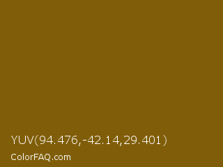 YUV 94.476,-42.14,29.401 Color is a dark orange color and the nearest color is Yukon Gold #7b6608. Hex code #805e09 and RGB value is rgb(128,94,9). In RGB color space, this color is composed of 50% red, 37% green, 4% blue, In CMYK color space, this color is composed of 0% cyan, 27% magenta, 93% yellow , 50% black , In HSL color space, this color has a hue angle of 43° , 87% saturation and 27% lightness.