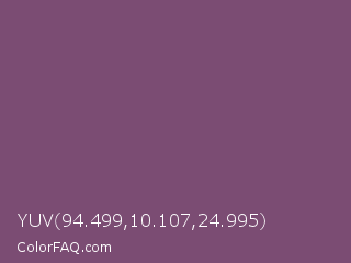 YUV 94.499,10.107,24.995 Color is a normal magenta color and the nearest color is Twilight Lavender #8a496b. Hex code #7b4c73 and RGB value is rgb(123,76,115). In RGB color space, this color is composed of 48% red, 30% green, 45% blue, In CMYK color space, this color is composed of 0% cyan, 38% magenta, 7% yellow , 52% black , In HSL color space, this color has a hue angle of 310° , 24% saturation and 39% lightness.