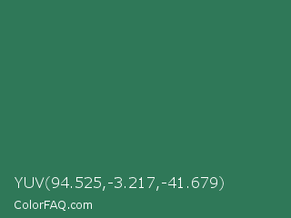 YUV 94.525,-3.217,-41.679 Color is a normal green color and the nearest color is Amazon #3b7a57. Hex code #2f7858 and RGB value is rgb(47,120,88). In RGB color space, this color is composed of 18% red, 47% green, 35% blue, In CMYK color space, this color is composed of 61% cyan, 0% magenta, 27% yellow , 53% black , In HSL color space, this color has a hue angle of 154° , 44% saturation and 33% lightness.