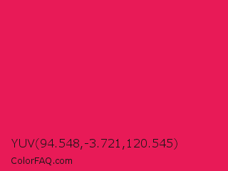 YUV 94.548,-3.721,120.545 Color is a normal rose color and the nearest color is Spanish Crimson #e51a4c. Hex code #e81a57 and RGB value is rgb(232,26,87). In RGB color space, this color is composed of 91% red, 10% green, 34% blue, In CMYK color space, this color is composed of 0% cyan, 89% magenta, 63% yellow , 9% black , In HSL color space, this color has a hue angle of 342° , 82% saturation and 51% lightness.