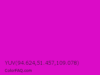 YUV 94.624,51.457,109.078 Color is a normal magenta color and the nearest color is Deep Magenta #cc00cc. Hex code #db0bc7 and RGB value is rgb(219,11,199). In RGB color space, this color is composed of 86% red, 4% green, 78% blue, In CMYK color space, this color is composed of 0% cyan, 95% magenta, 9% yellow , 14% black , In HSL color space, this color has a hue angle of 306° , 90% saturation and 45% lightness.