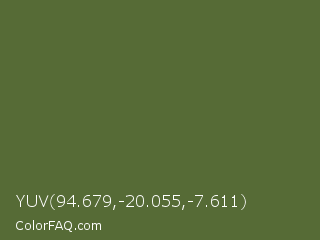 YUV 94.679,-20.055,-7.611 Color is a normal green color and the nearest color is Dark Olive Green #556b2f. Hex code #566b36 and RGB value is rgb(86,107,54). In RGB color space, this color is composed of 34% red, 42% green, 21% blue, In CMYK color space, this color is composed of 20% cyan, 0% magenta, 50% yellow , 58% black , In HSL color space, this color has a hue angle of 84° , 33% saturation and 32% lightness.