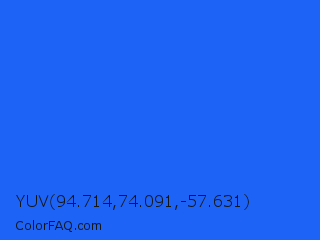 YUV 94.714,74.091,-57.631 Color is a normal blue color and the nearest color is Blue Crayola #1f75fe. Hex code #1d63f5 and RGB value is rgb(29,99,245). In RGB color space, this color is composed of 11% red, 39% green, 96% blue, In CMYK color space, this color is composed of 88% cyan, 60% magenta, 0% yellow , 4% black , In HSL color space, this color has a hue angle of 221° , 92% saturation and 54% lightness.