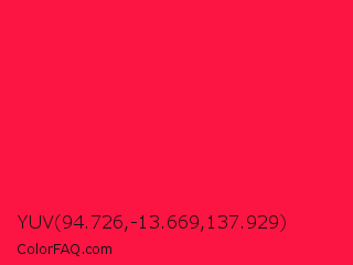 YUV 94.726,-13.669,137.929 Color is a normal red color and the nearest color is Torch Red #fd0e35. Hex code #fc1443 and RGB value is rgb(252,20,67). In RGB color space, this color is composed of 99% red, 8% green, 26% blue, In CMYK color space, this color is composed of 0% cyan, 92% magenta, 73% yellow , 1% black , In HSL color space, this color has a hue angle of 348° , 97% saturation and 53% lightness.