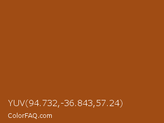 YUV 94.732,-36.843,57.24 Color is a normal orange color and the nearest color is Hawaiian Tan #9d5616. Hex code #a04c14 and RGB value is rgb(160,76,20). In RGB color space, this color is composed of 63% red, 30% green, 8% blue, In CMYK color space, this color is composed of 0% cyan, 53% magenta, 88% yellow , 37% black , In HSL color space, this color has a hue angle of 24° , 78% saturation and 35% lightness.