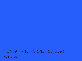 YUV 94.741,76.543,-50.639 Color is a normal blue color and the nearest color is Blue Crayola #1f75fe. Hex code #255efa and RGB value is rgb(37,94,250). In RGB color space, this color is composed of 15% red, 37% green, 98% blue, In CMYK color space, this color is composed of 85% cyan, 62% magenta, 0% yellow , 2% black , In HSL color space, this color has a hue angle of 224° , 96% saturation and 56% lightness.
