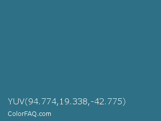 YUV 94.774,19.338,-42.775 Color is a normal blue color and the nearest color is Calypso #31728d. Hex code #2e7086 and RGB value is rgb(46,112,134). In RGB color space, this color is composed of 18% red, 44% green, 53% blue, In CMYK color space, this color is composed of 66% cyan, 16% magenta, 0% yellow , 47% black , In HSL color space, this color has a hue angle of 195° , 49% saturation and 35% lightness.