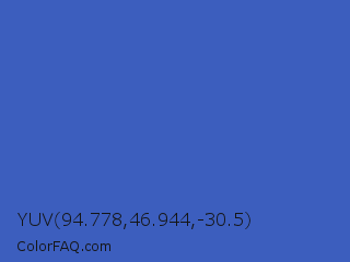 YUV 94.778,46.944,-30.5 Color is a normal blue color and the nearest color is Cerulean Blue #2a52be. Hex code #3c5ebe and RGB value is rgb(60,94,190). In RGB color space, this color is composed of 24% red, 37% green, 75% blue, In CMYK color space, this color is composed of 68% cyan, 51% magenta, 0% yellow , 25% black , In HSL color space, this color has a hue angle of 224° , 52% saturation and 49% lightness.