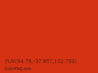 YUV 94.79,-37.857,102.793 Color is a normal red color and the nearest color is Vermilion #d9381e. Hex code #d43212 and RGB value is rgb(212,50,18). In RGB color space, this color is composed of 83% red, 20% green, 7% blue, In CMYK color space, this color is composed of 0% cyan, 76% magenta, 92% yellow , 17% black , In HSL color space, this color has a hue angle of 10° , 84% saturation and 45% lightness.
