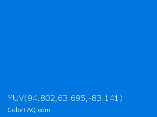 YUV 94.802,63.695,-83.141 Color is a normal blue color and the nearest color is True Blue #0073cf. Hex code #0076e0 and RGB value is rgb(0,118,224). In RGB color space, this color is composed of 0% red, 46% green, 88% blue, In CMYK color space, this color is composed of 100% cyan, 47% magenta, 0% yellow , 12% black , In HSL color space, this color has a hue angle of 208° , 100% saturation and 44% lightness.
