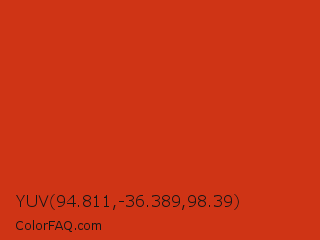 YUV 94.811,-36.389,98.39 Color is a normal red color and the nearest color is Vermilion #d9381e. Hex code #cf3415 and RGB value is rgb(207,52,21). In RGB color space, this color is composed of 81% red, 20% green, 8% blue, In CMYK color space, this color is composed of 0% cyan, 75% magenta, 90% yellow , 19% black , In HSL color space, this color has a hue angle of 10° , 82% saturation and 45% lightness.